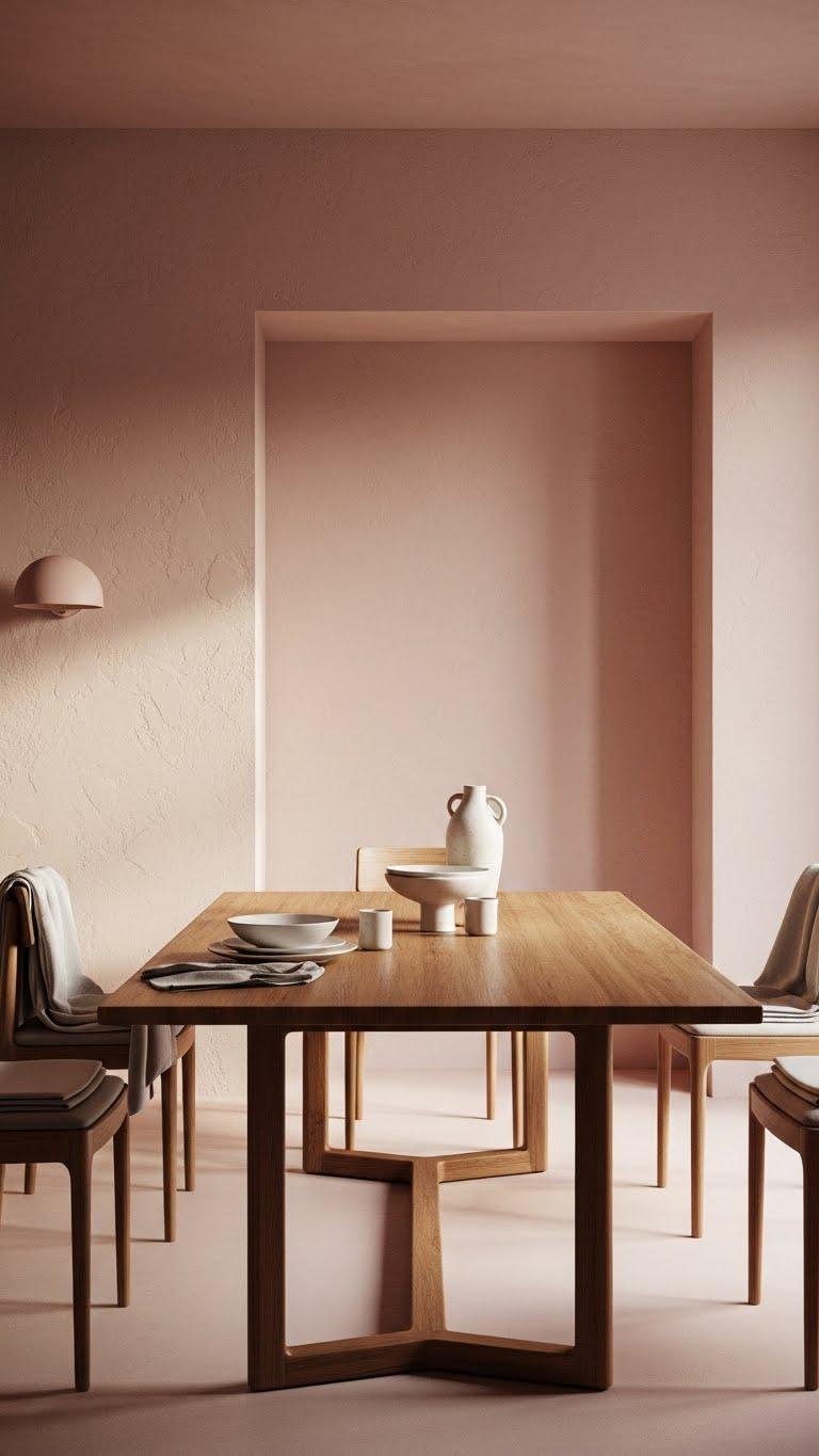 Sink into a plaster pink dining room that feels both tactile and refined, where the soft, velvety wall finish wraps the space in a warm, muted glow.