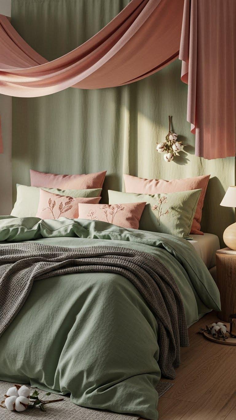 Because soft sage calms the eye while rose tones warm the skin, pairing them creates a quietly romantic bedroom that feels both fresh and lived-in. You’ll layer sage linens for a grounded, breathable base, then add a rose canopy or pillows to inject warmth and freedom. Keep textures natural, motifs minimal, and lighting soft to sustain intimacy without feeling fussy.