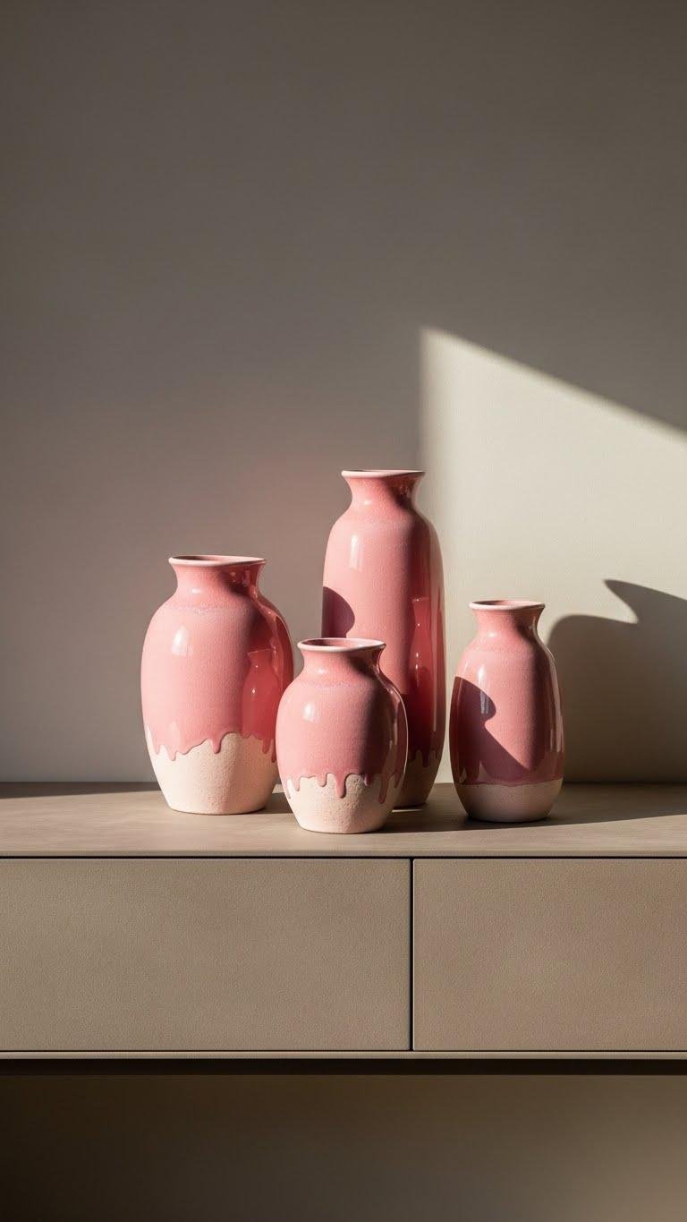 Pink-Glazed Ceramic Vases on a Taupe Console