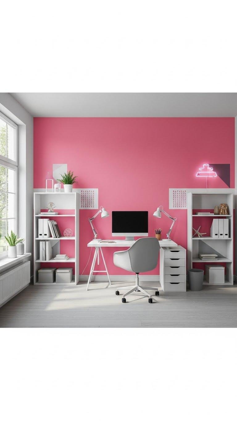 Start by grounding the room with a single bubblegum pink accent wall to inject energy without overwhelming your workspace.