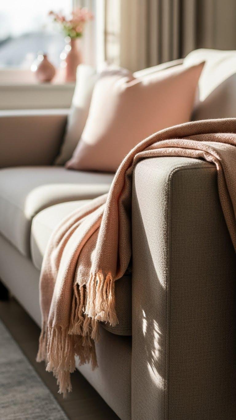 Often a quick swap, layering a blush throw on a neutral couch instantly softens the silhouette and ties together pink accents without overwhelming the room.