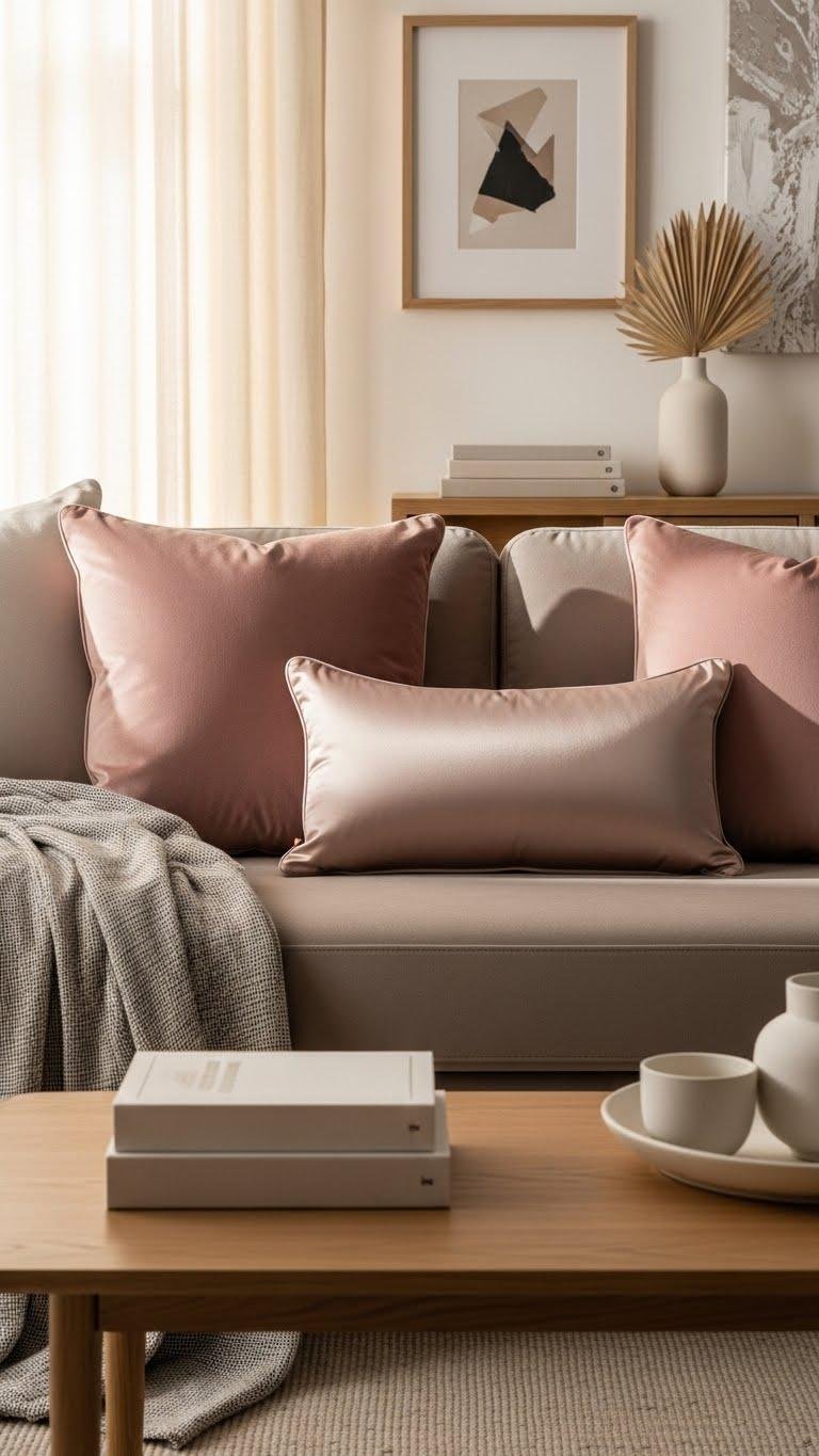 Framed against a soft taupe sofa, rose velvet pillows bring a quiet, tactile confidence that lifts the palette without overpowering it. You’ll pair velvet tufting with muted piping for refined texture, add a silk lumbar for sleek balance, and introduce linen contrast to keep the look grounded.