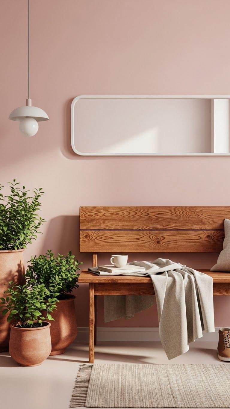 Against a soft pink backdrop, a warm wood bench anchors the entryway and sets a calm, welcoming tone the moment you step inside.