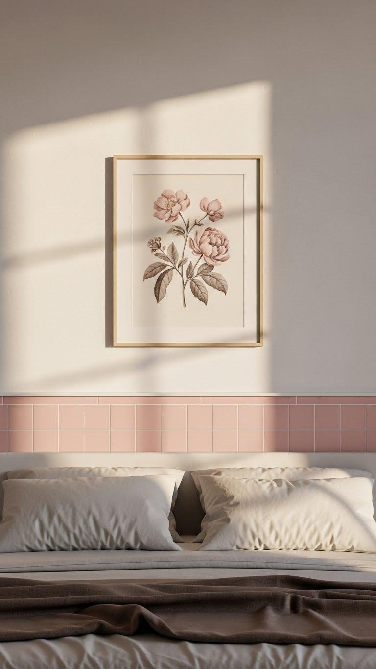 Choose a vintage botanical print or a muted watercolor study framed simply; it grounds the headboard, frees your palette, and feels curated without constraint — a soft statement that reads elegant, calm, and deliberately personal.