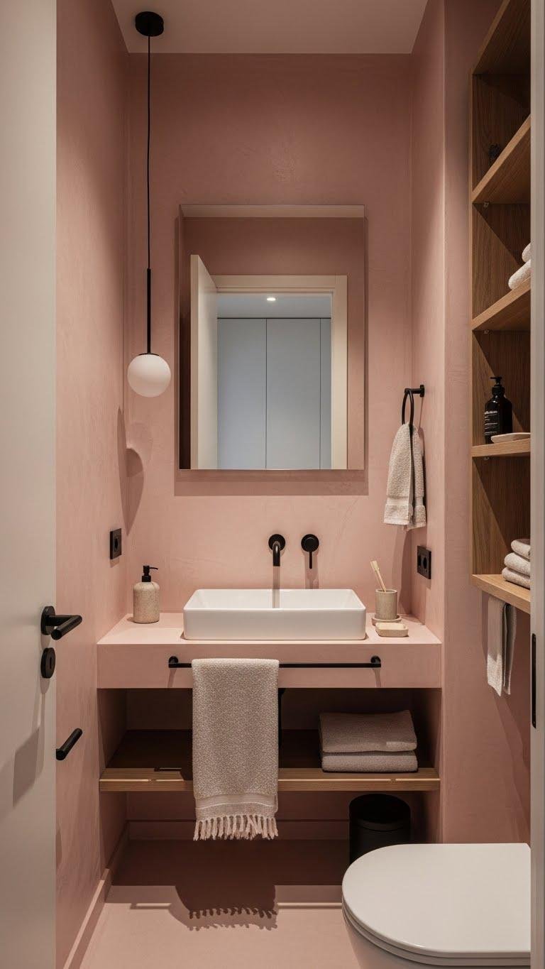 Your powder room can become a quietly luxurious moment of pink by choosing a soft plaster finish and matte fixtures that absorb light rather than shout it.