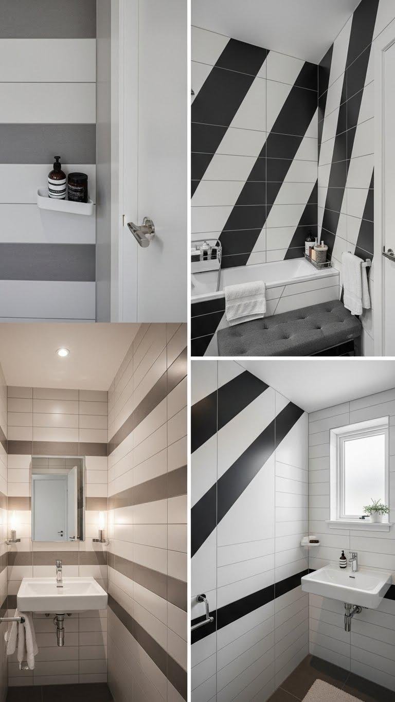 Striped tile layouts give a bathroom instant rhythm and scale, letting you stretch a tiny powder room or add height to a low-ceilinged space with nothing more than grout lines.