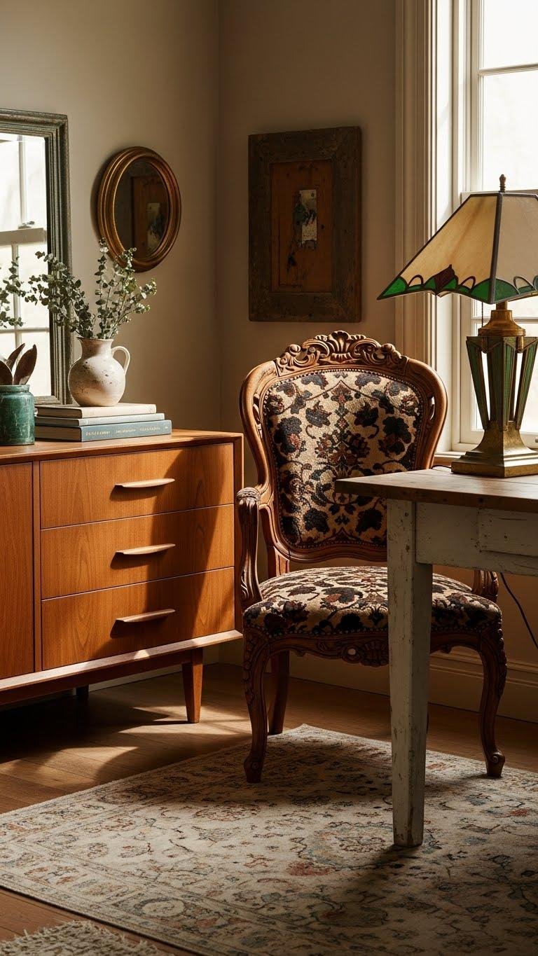 When you pair a mid-century dresser with a carved Victorian chair or a farmhouse table alongside an art deco lamp, the room immediately feels curated rather than staged.
