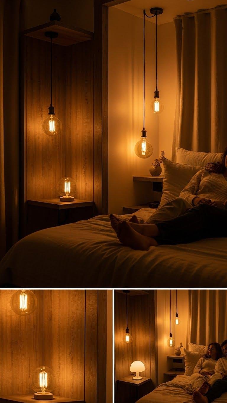 You’ll want a dimmable pendant centered over the bed and strategically placed soft glow diffusers to soften edges. Layered warmth lets you control mood, invite spontaneity, and keep the space feeling open, private, and effortlessly romantic.