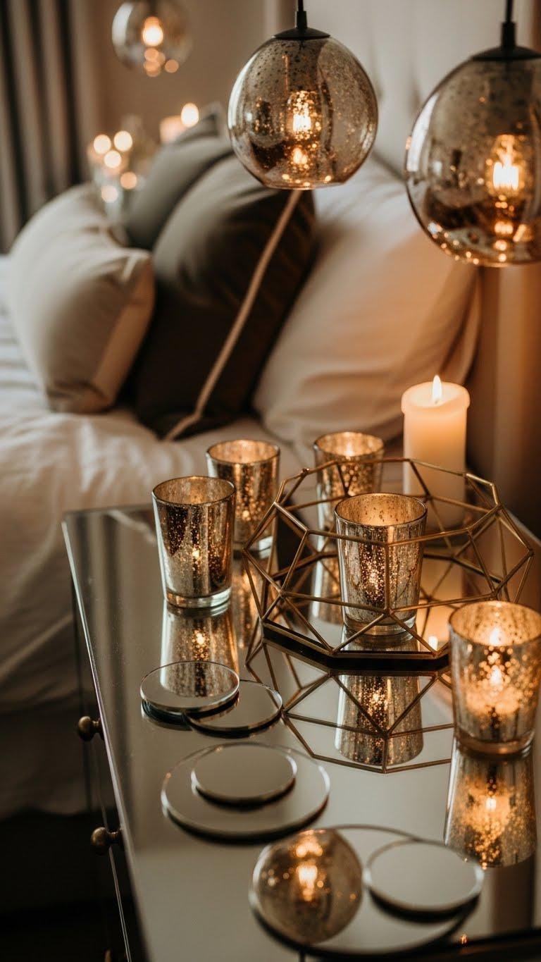 Often the smallest metallic accent or a single mirrored surface can radically lift a bedroom’s mood, catching candlelight and those sculptural fixtures you’ve chosen to create a layered, romantic glow.