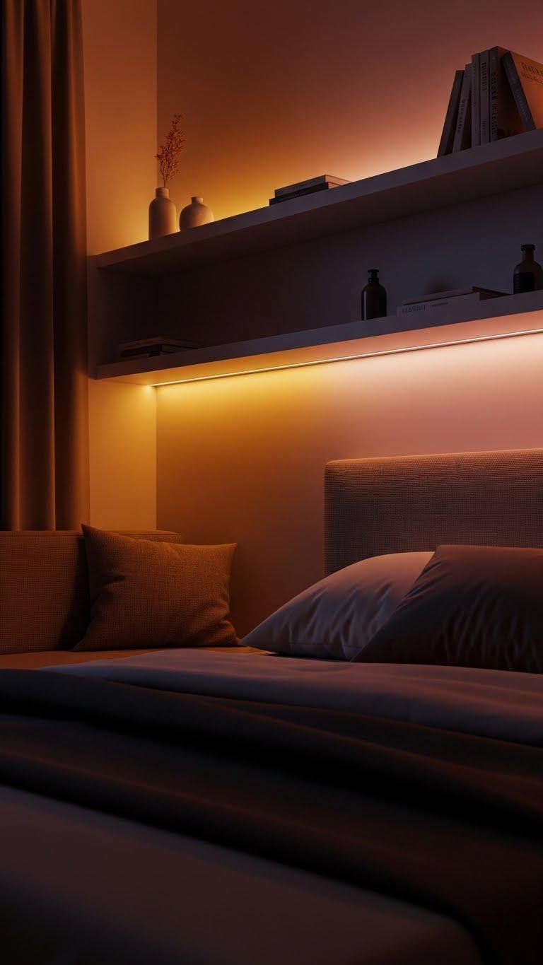 You’ll use hidden LED strips behind headboards, shelves, or coves to craft a subtle indirect glow that flatters skin and textiles.