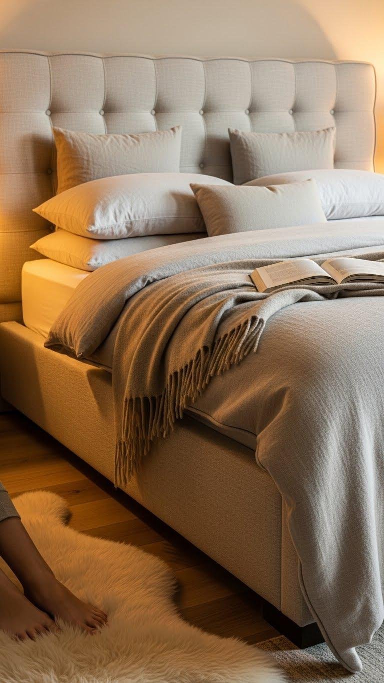 After the soft landing of a sheepskin underfoot, draw the eye upward to a padded headboard or fully upholstered bed frame to complete that cocooned feeling—it’s where tactile comfort meets visual luxury.