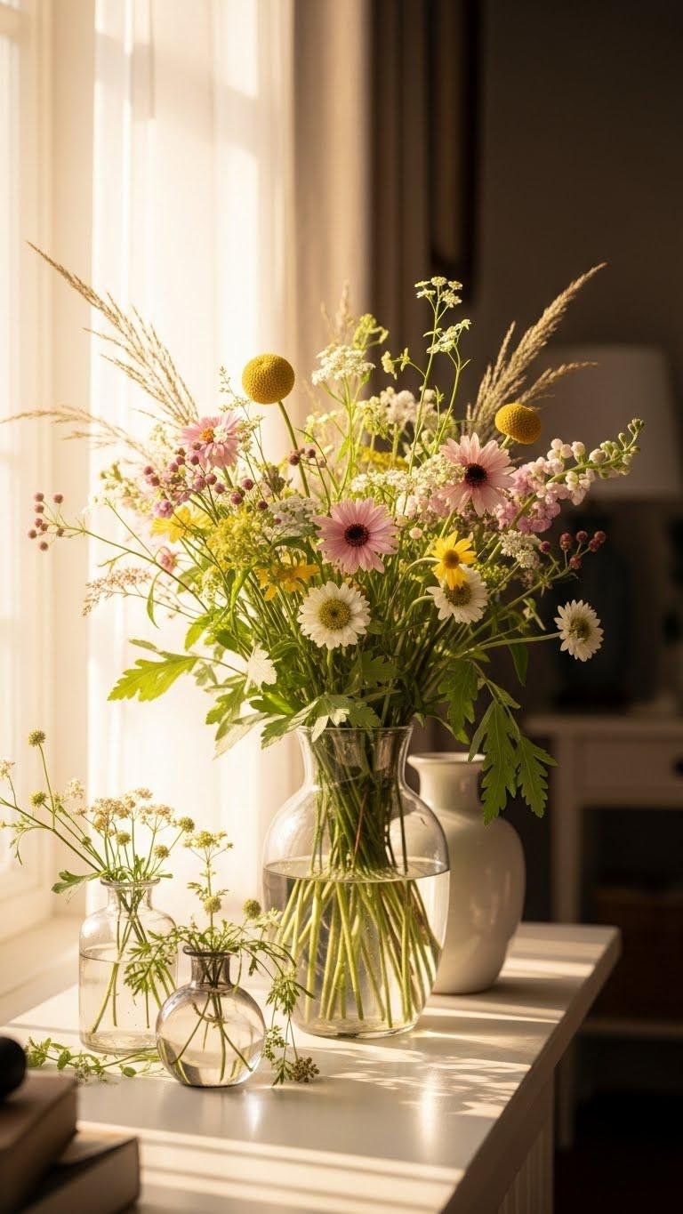 Often a single vase of fresh blooms can transform a room, giving it immediacy, scent, and a soft focal point that complements your larger plants. You’ll curate meadow inspired bouquets, mix textures, and let stems drape freely in seasonal bud vases. Place them on windowsills, nightstands, or entry consoles to invite scent, movement, and an effortless, liberated elegance throughout your space.