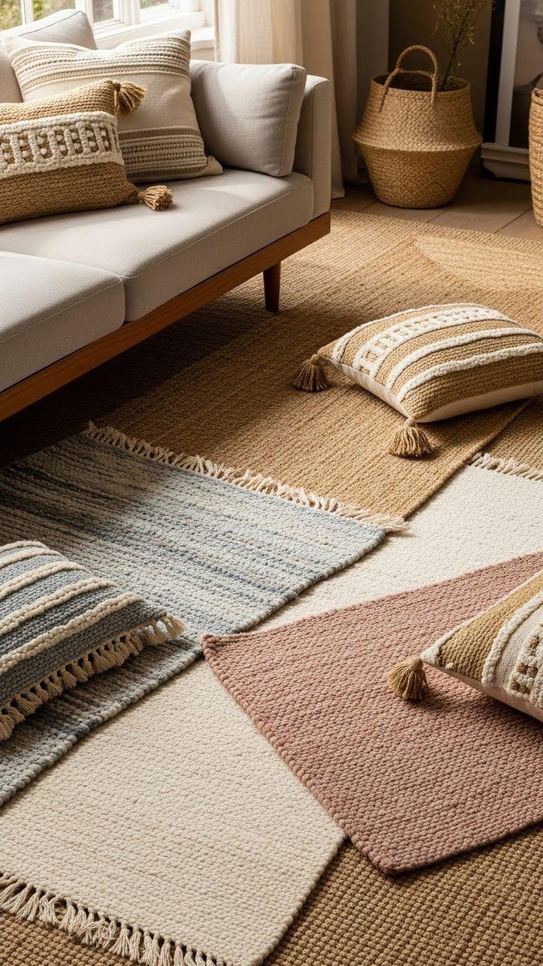 Layered texture brings a room to life, and wool rugs paired with jute textiles give your space a warm, modern-romantic foundation you’ll want to sink your feet into. Choose handwoven wool rugs with soft pile and muted tones, then anchor seating with jute runners and pillows trimmed in jute tassels. You’ll create tactile freedom, earthy warmth, and effortless, lived-in elegance.