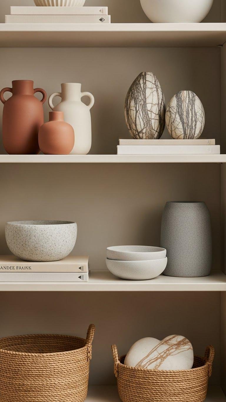 Bring together ceramic and stone pieces to give your shelves tactile warmth and sculptural interest—their matte glazes and raw veining read as subtle jewelry against books and woven baskets. You’ll mix hand thrown vases with matte pebbleware bowls, alternating heights and voids. Let negative space breathe, layer textures, and edit freely so each object feels intentional, lived-in, and effortlessly romantic.