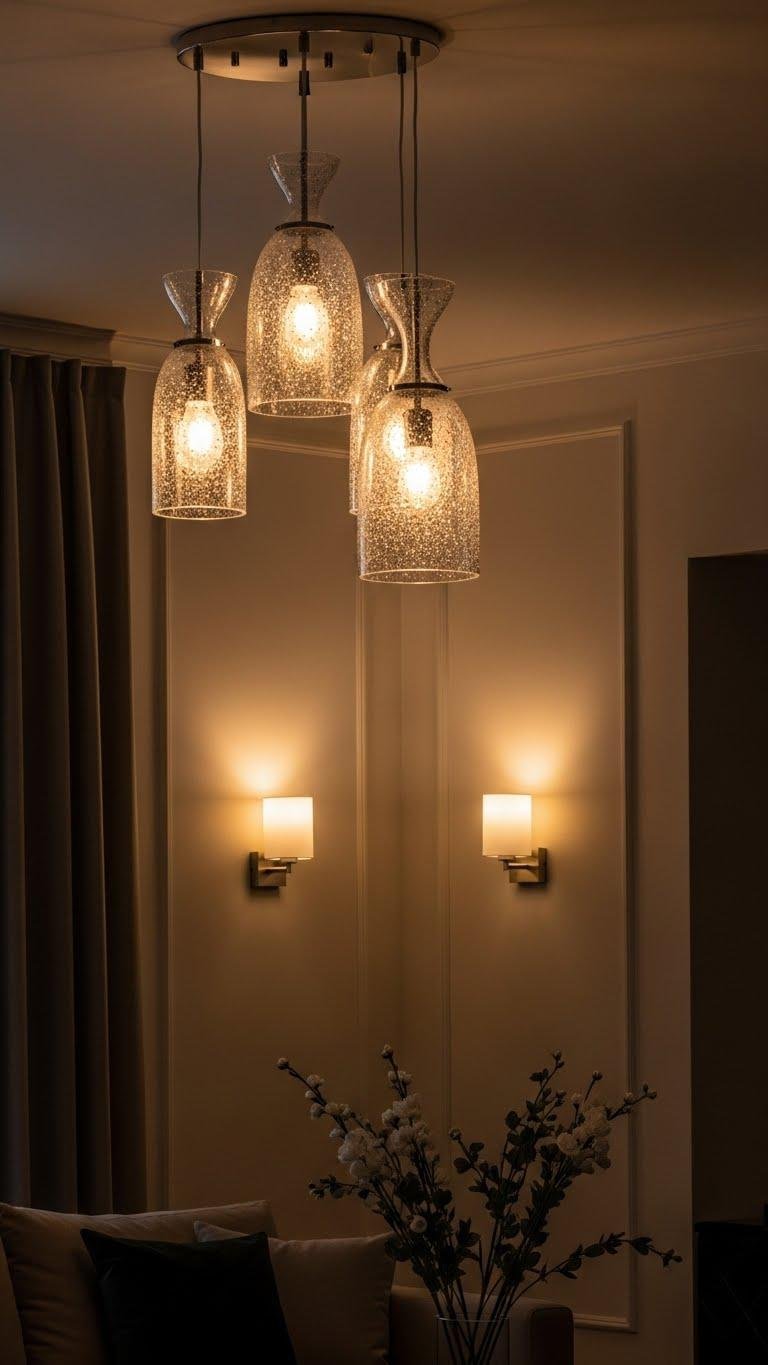 Frequently, glass chandeliers and soft sconces give a room an immediate lift, their translucent forms throwing a layered, flattering glow that reads both modern and timeless. You’ll choose crystal pendants for sparkle without stiffness, or lean into frosted sconces for a demure wash. Position fixtures to sculpt corners and nooks, letting light free the space and invite relaxed, adventurous evenings.