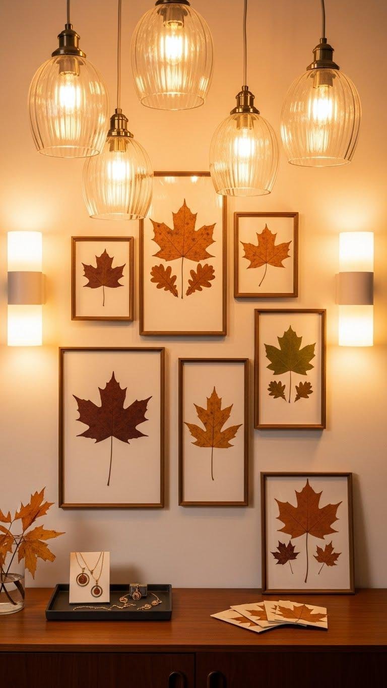 You’ll mix shapes and tones, float specimens in slim frames, and echo them with small accessories—pressed leaf jewelry displayed nearby, maple leaf bookmarks in a stack—inviting a liberated, handcrafted vignette that’s both modern and intimate.