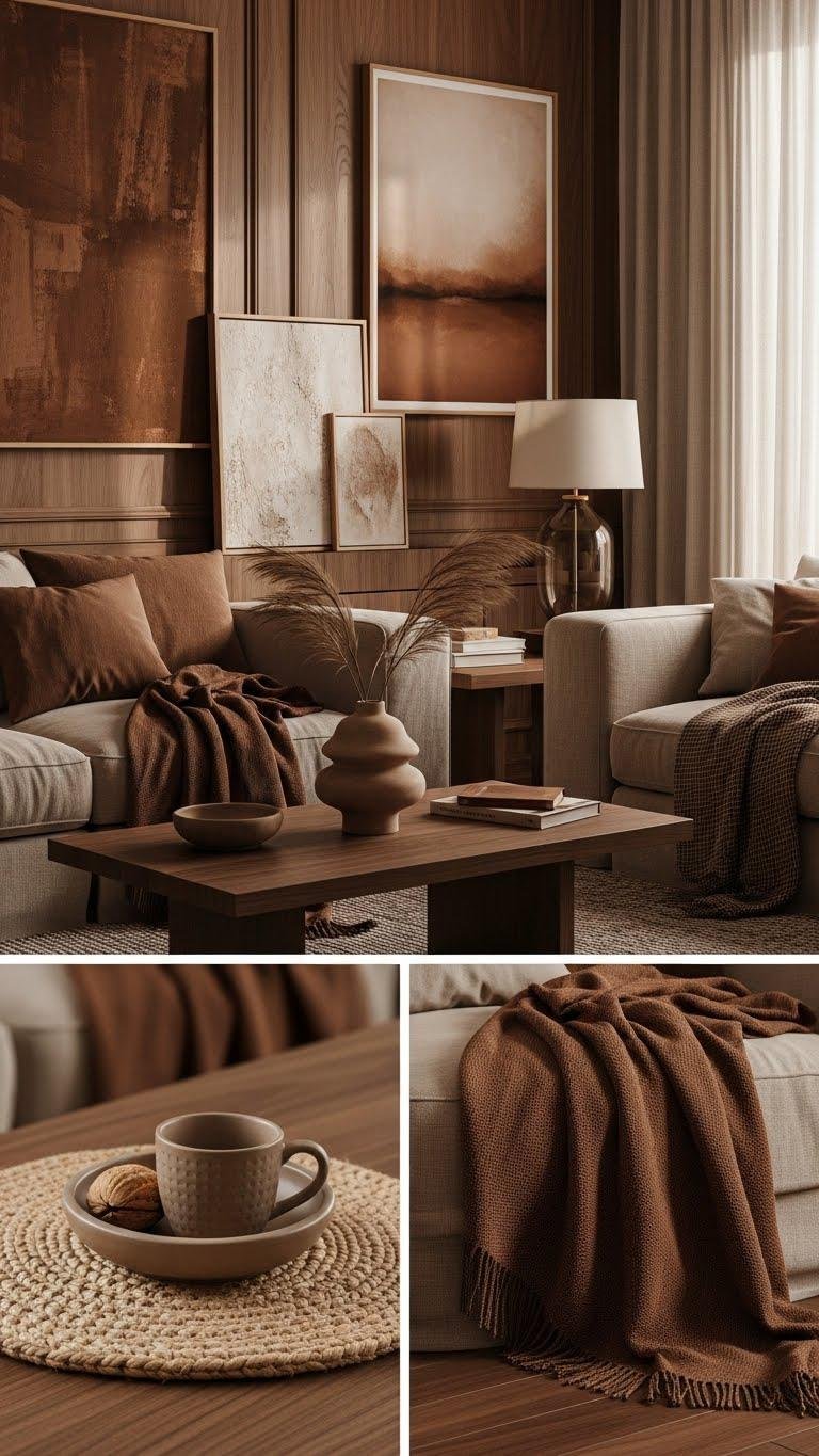 Layer warm mocha with richer brown-based tones to craft a space that feels cultivated and comfortably lived-in. You’ll mix mocha accents with warm walnut surfaces, layer cocoa textiles over linen, and hang chestnut art for depth.