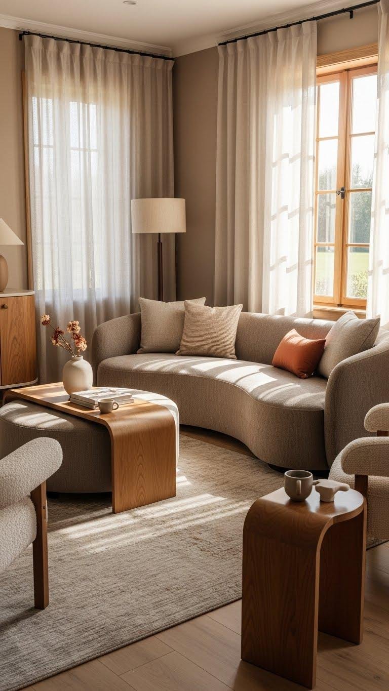 After choosing an oversized sofa that invites lounging, soften the room’s geometry by swapping hard corners for rounded edges that coax movement and lower visual tension. You’ll love how a rounded ottoman anchors conversation, curved side tables ease circulation, and softened armchairs invite unhurried afternoons. Choose sculptural silhouettes, warm woods, and subtle curves to make your space feel liberated, tactile, and quietly romantic.