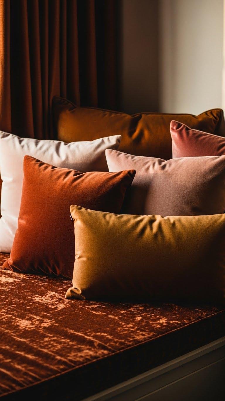 Layer velvet cushions in warm tones to instantly heighten your room’s romantic mood and tactile appeal. You’ll mix rust, blush, and deep ochre cushions against a plush windowseat or beside a velvet headboard, creating layered softness that invites lingering. Choose varied sizes, matte and shimmering textures, and mindful placement so each cushion feels intentional, cozy, and effortlessly liberated.