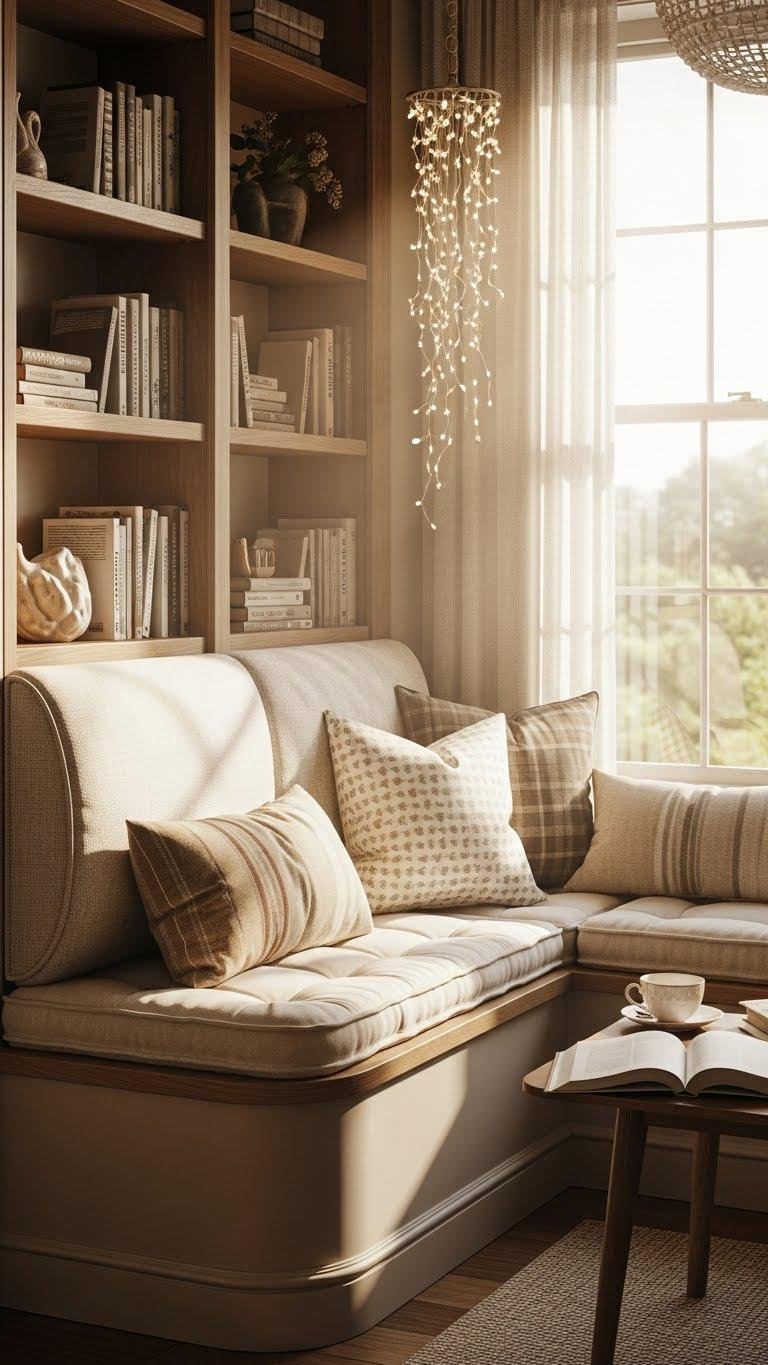 While you’ll want to anchor the corner with a low, built-in bench, think of the banquette as a mini-retreat that wraps you in texture and light — a place where a curved backrest, plush seat cushion, and a scattering of mixed-fabric pillows invite lingering with a book and tea. Add built in shelves, a sunlit window seat, cascading fairylights, and a slender low table for freedom-loving comfort.