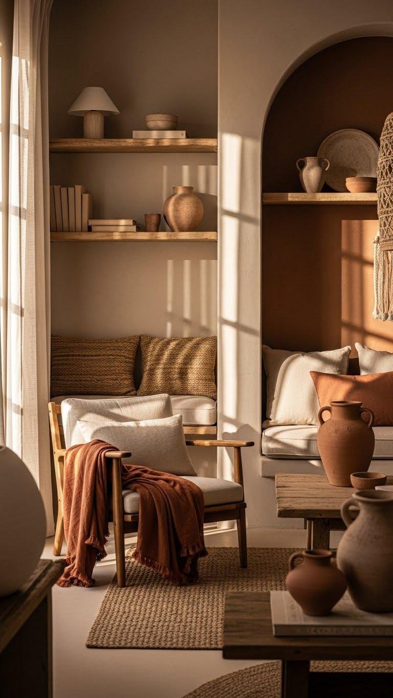 After you’ve carved out a sunlit reading nook wrapped in linen and soft cushions, bring that same warm calm into the rest of the room by pairing earthy neutrals with terracotta accents. You’ll mix muted earth tone walls, raw wood, and woven linens with soft terracotta throws and terra cotta vases. Let handmade pottery punctuate shelves, inviting relaxed, liberated comfort.
