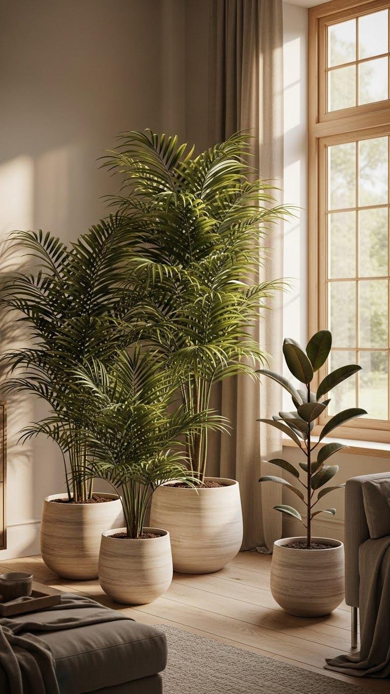 Anchor the room with a statement plant—think a tall fiddle‑leaf fig, kentia palm, or rubber tree—to add vertical drama, soften hard lines, and breathe life into your cozy palette. You’ll place an indoor ficus near light, layer floor standing palms for movement, and pick sculptural pots that feel effortless. These large plants make the space feel free, soulful, and quietly luxurious.