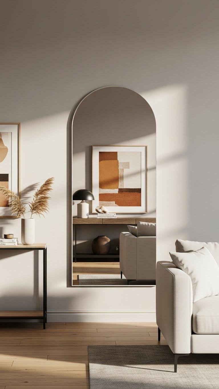 Bring in an arched mirror to soften hard angles and instantly lift a room’s mood; its curved silhouette breaks up rectilinear lines and adds a subtle architectural flourish without clutter.
