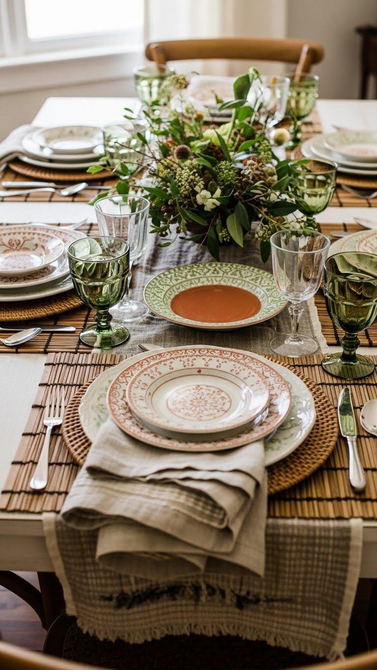 After you’ve layered natural textures like bamboo and rattan, let your table tell the next chapter: mix-and-match dining tablescapes celebrate collected style and seasonal shifts by pairing varied plates, glassware, and linens with a cohesive color story.