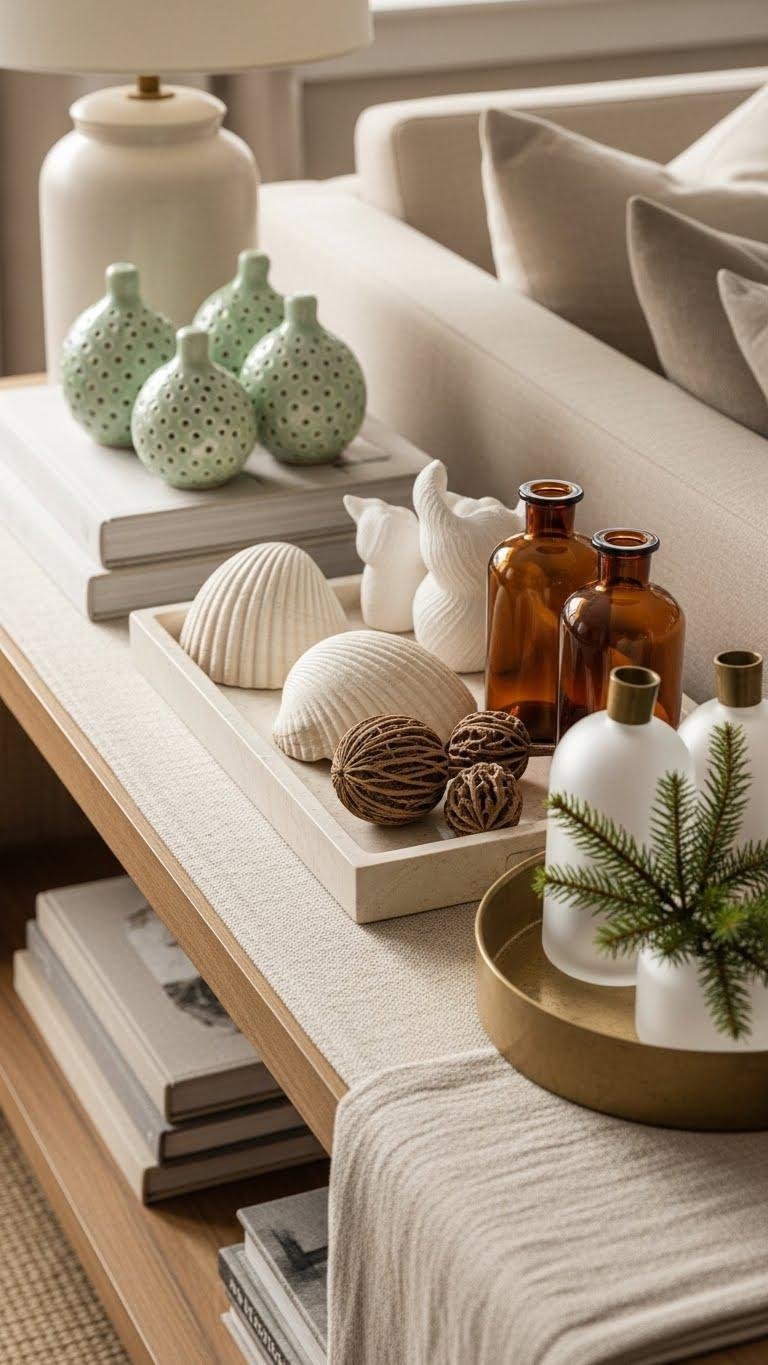 Layer a decorative tray on a console or coffee table to corral seasonal finds—think banyan-branch ceramics in spring, sculptural shells in summer, amber glass and seed pods in fall, and frosted brass with small evergreens in winter—so you can swap a whole vignette in seconds without disrupting the room’s flow.