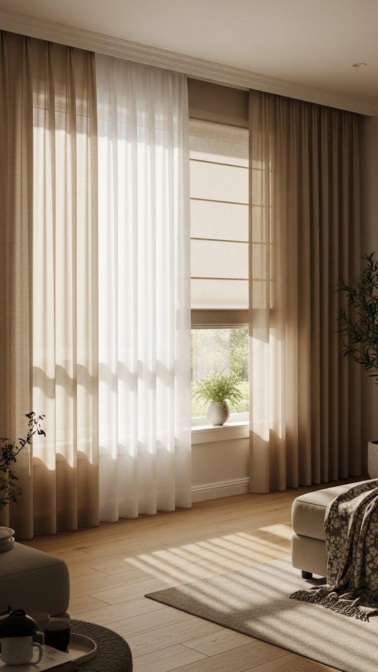 After anchoring your gallery with a few permanent artworks and swapping smaller pieces by season, carry that same thoughtful rhythm to windows by choosing soft-toned treatments that quietly shift the room’s mood. Mix sheer thermal panels for light, airy mornings with linen blackout layers for privacy and calm evenings. You’ll curate breathable neutrality that adapts, freeing you to change accents, texture, and light with ease.