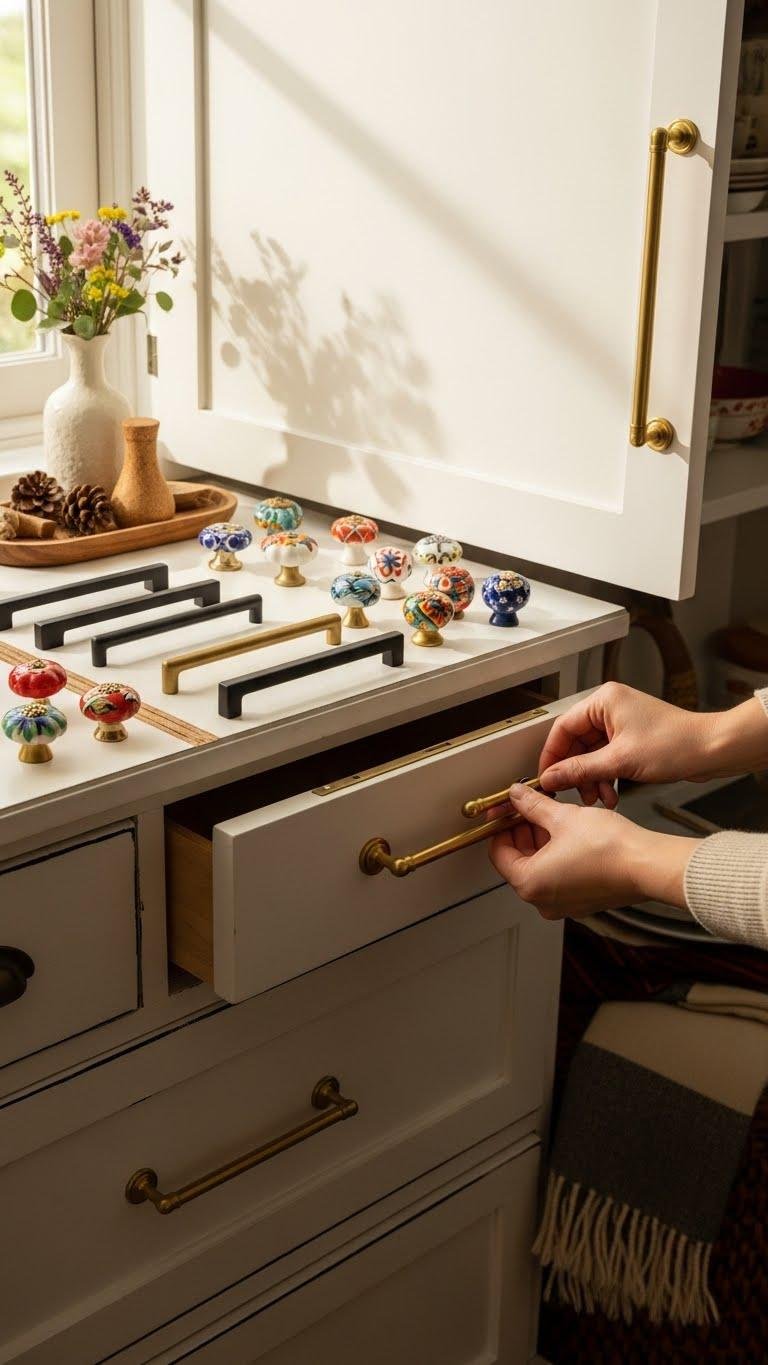 Choose warm brass pulls for vintage glamour or matte black for modern edge; add playful ceramic knobs to punctuate seasonally.