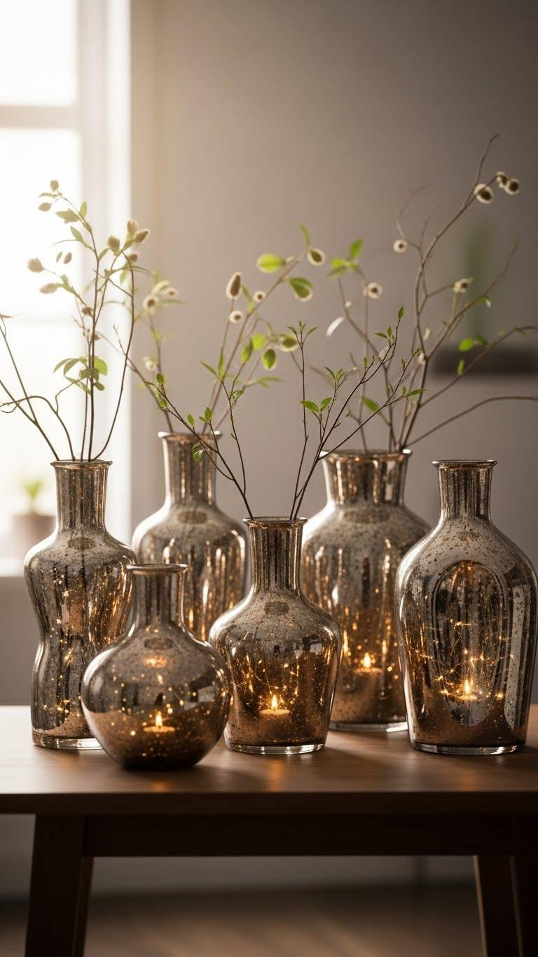 Pair mercury glass vases with soft lighting to create an enduring, reflective centerpiece that reads both vintage and contemporary. You’ll balance sculptural shapes and patinaed finishes, placing luminescent vases among wild stems or bare branches. Keep arrangements airy, rotate seasonal blooms, and let the glow evolve with candles or fairy lights—freedom to refresh mood and movement without heavy overhaul.