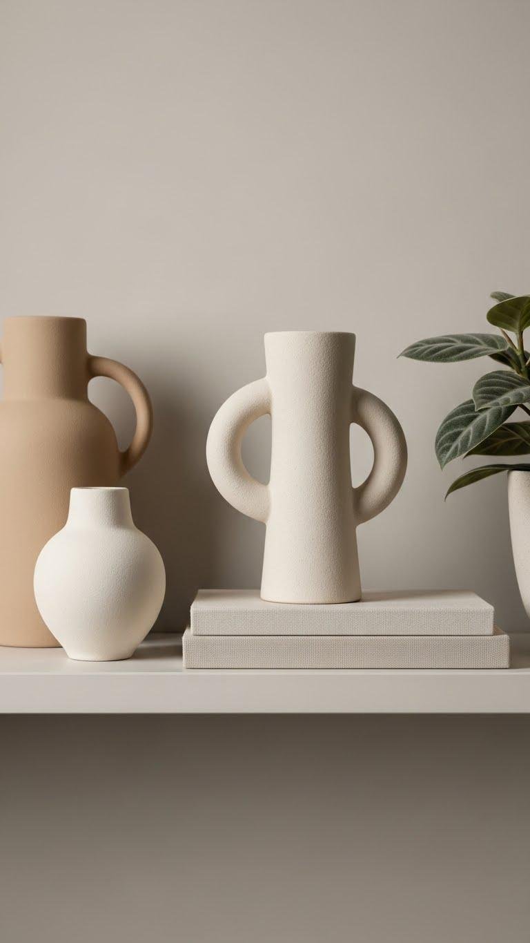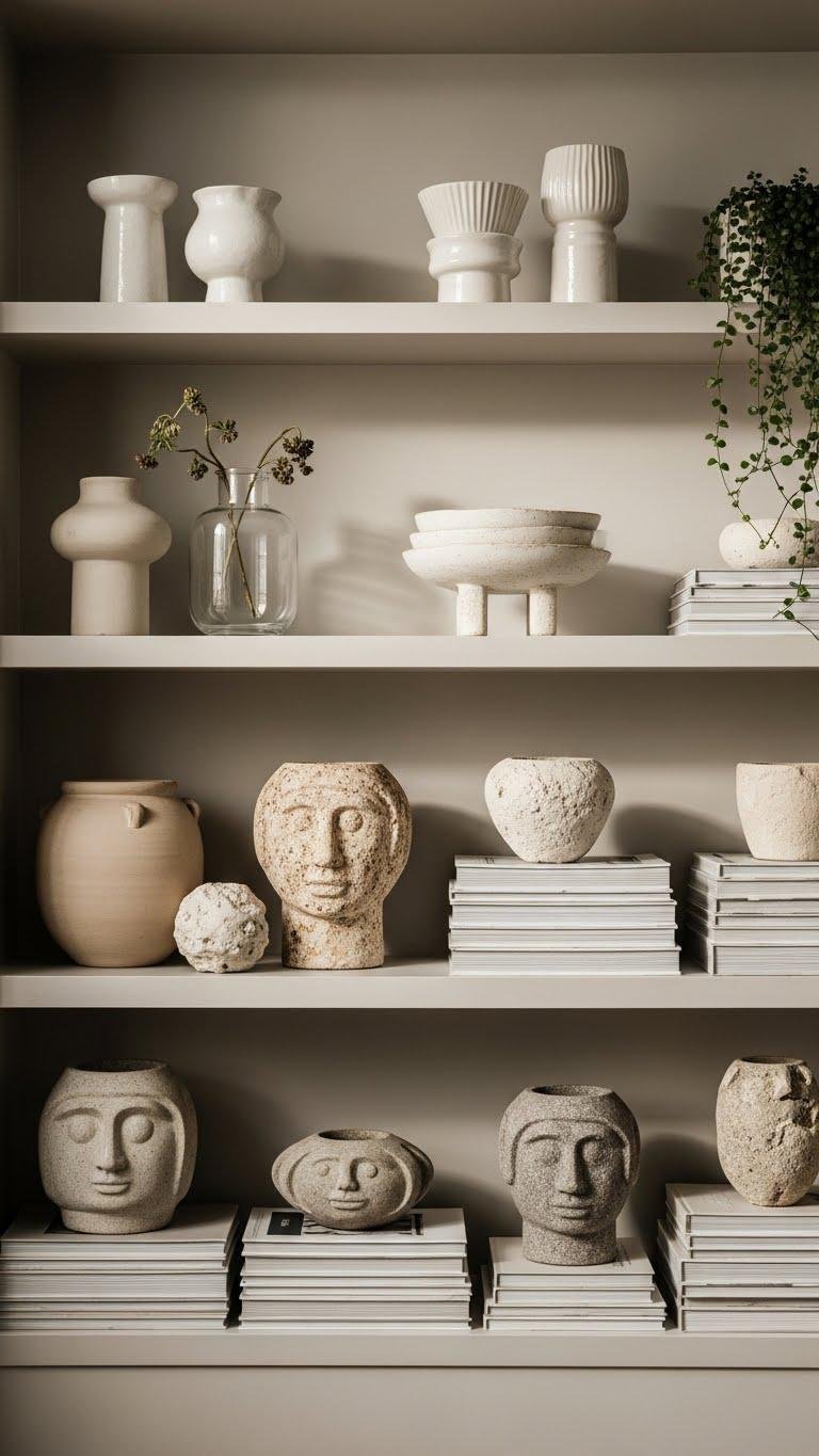 You’ll choose a neutral palette, letting sculptural ceramics, books, and plants read as one cohesive statement.