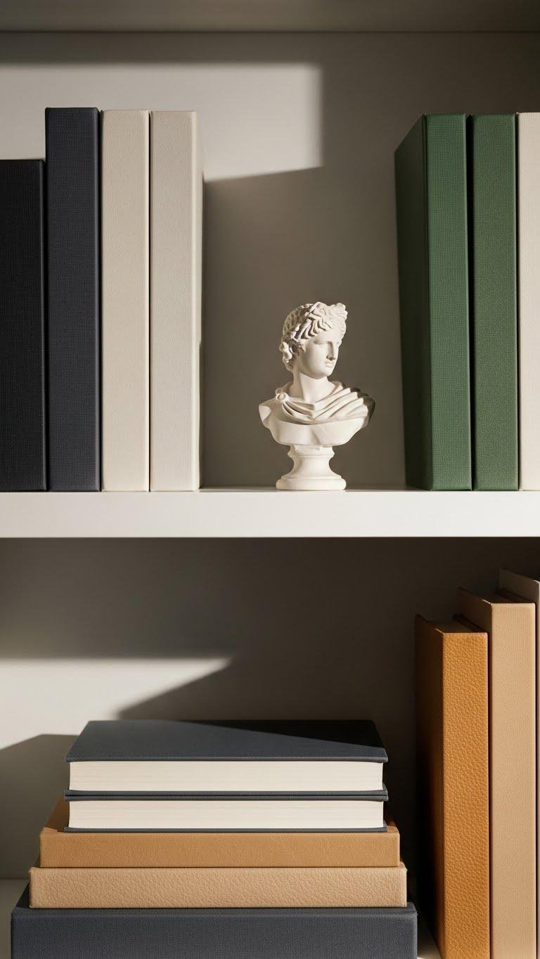 You’ll place miniature busts center stage, using hardcover framing for contrast and rhythm. Keep negative space, vary heights, and choose tactile covers so the composition feels curated, modern, and effortlessly free.