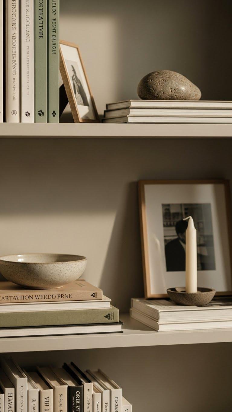 After alternating full and airy shelves, bring your attention down to small vignettes: low-lying objects perched on stacked books instantly anchor a shelf while keeping the overall look light. You’ll layer low profile ceramics, a sculptural paperweight, or a single candle on slim stacks, then tuck flat photo frames sideways for intimacy. Keep scales modest, textures varied, and placement effortless.