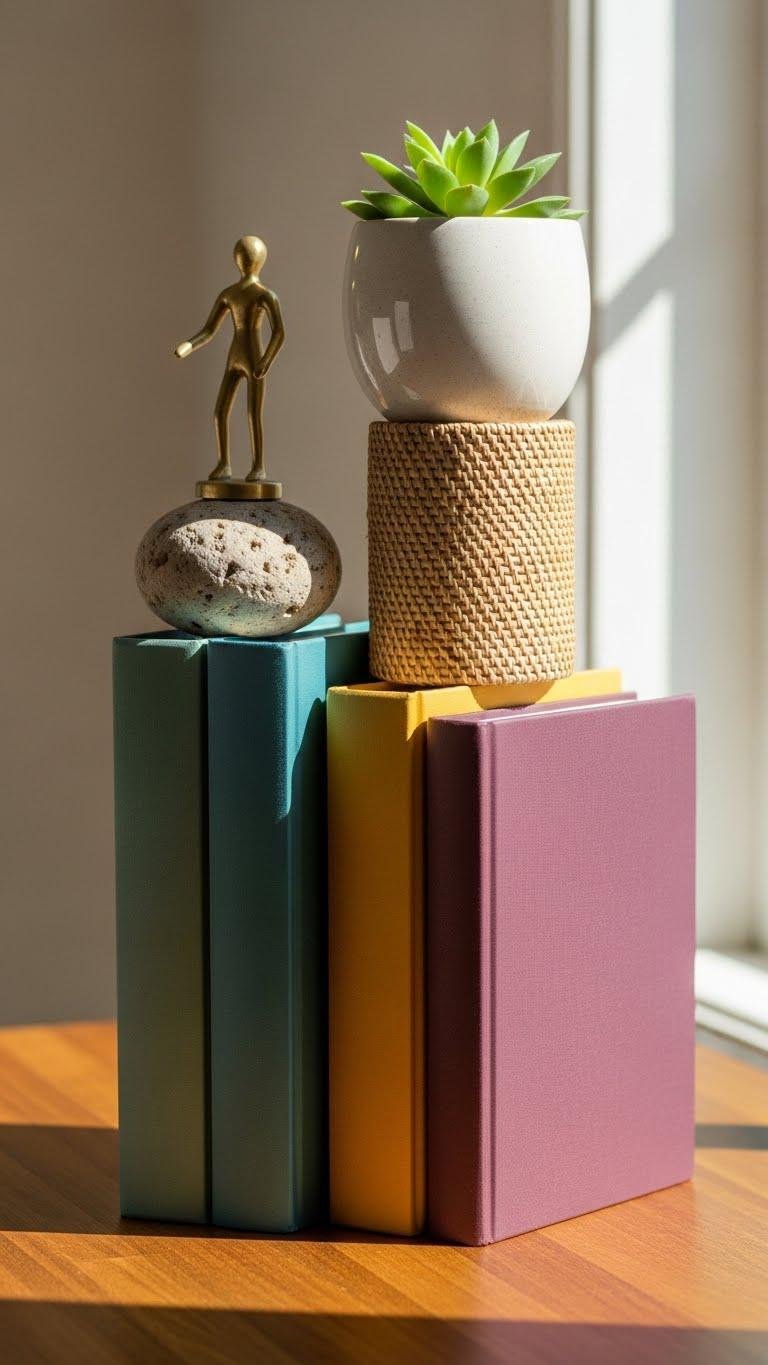 A stack of books becomes a deliberate pedestal when you top it with a single object—think a brass figurine, a small potted succulent, or a textured stone—so the pile reads as both collection and display.