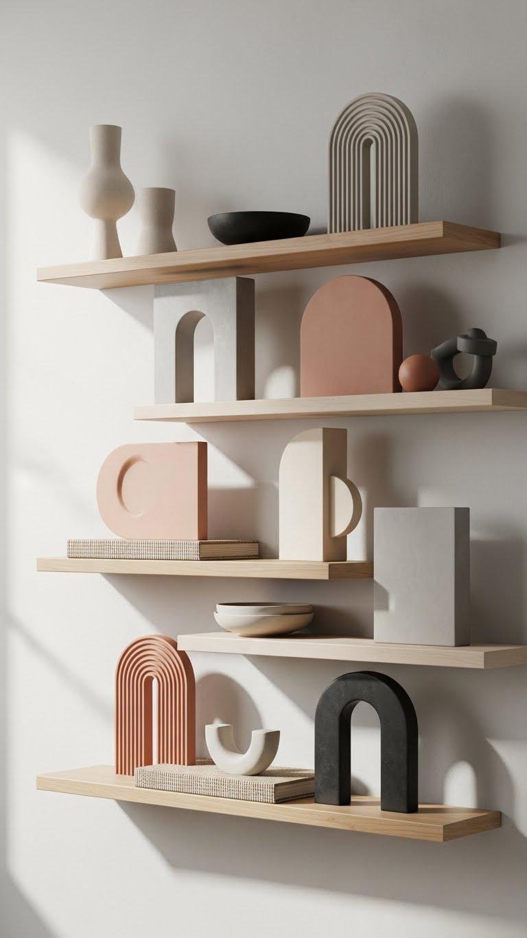Often, you’ll repeat a simple shape—like a circle, rectangle, or arch—across multiple shelves to create a quiet rhythm that ties disparate objects together.