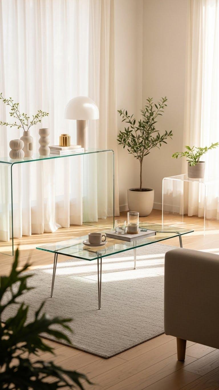 Choose leggy glass console or coffee tables to showcase rugs and plants; pick airy acrylic side tables to float accessories without visual weight. You’ll move freely, arrange light layers, and maintain a minimal, breathable layout that supports relaxed living.