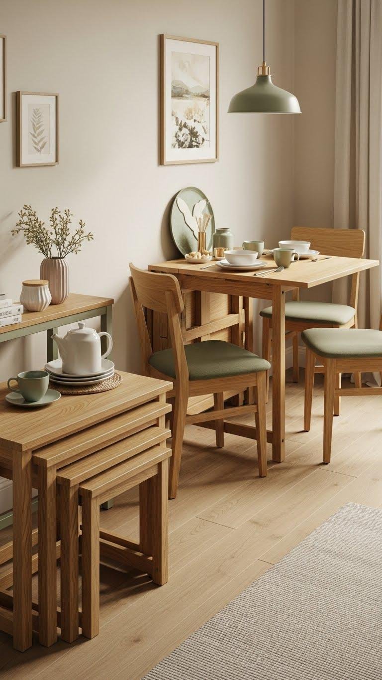 When space is tight, nesting and folding tables give you dining flexibility without permanent clutter: pull out a matching set of nesting tables to serve a meal, tuck them back under a console when you’re done, or unfold a compact drop-leaf table against the wall to create an instant dining surface. Choose lightweight pieces, use compact nesting for layered serving, and embrace folding dining for spontaneous gatherings.