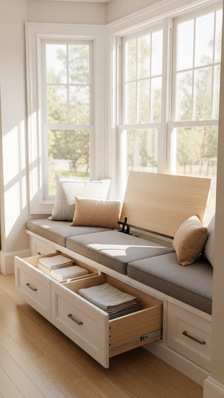 After you tuck away the tables, reclaim that sunny spot by building a window-seat with hidden storage beneath. You’ll gain neat under seat drawers for linens and gear, and cushioned setbacks that let you lounge without bulk.