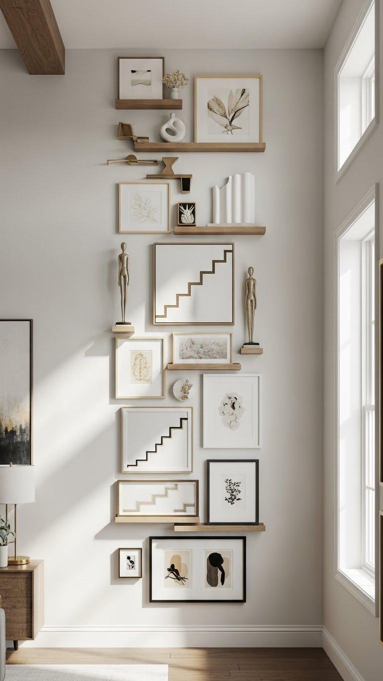 When you lift art vertically, you make the room feel taller and direct the eye upward — so stack a mix of frames, sculptures, and narrow shelves to create a deliberate column that connects floor to ceiling.