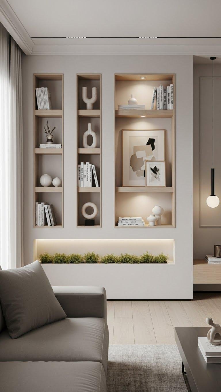If you want to add depth without stealing floor space, carve out recessed shelving or built-in niches to hold books, art, and accent lighting. You’ll create clean storage and display zones that free cluttered surfaces.