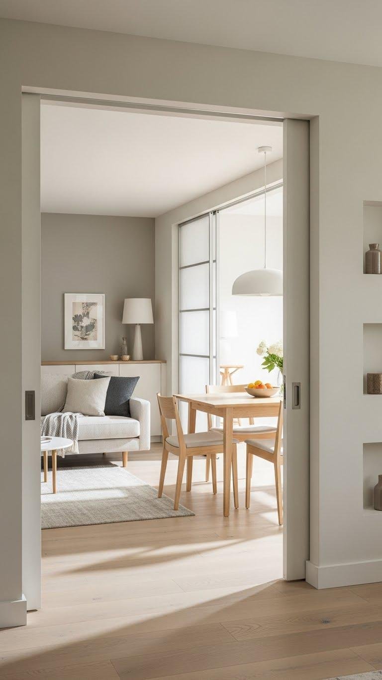 Built-in niches let you keep surfaces calm; pocket and sliding panels go further by reshaping how rooms connect. You can free floor space with hidden sliders that disappear into walls, letting you switch between open plan and private zones. Use translucent partitions to diffuse light while keeping sightlines, and choose simple finishes so movement feels effortless and the layout adapts to how you live.