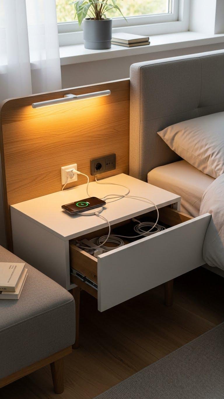 Pick a side table or headboard with wireless charging pads and drawers sized for cords. Integrate adjustable ambient illumination for reading and mood.