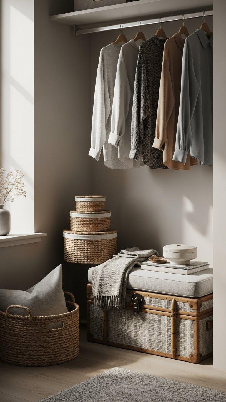 You’ll keep surfaces calm by choosing stackable baskets and decorative trunks that double as seating or side tables. Pick neutral tones, simple shapes, and tactile materials so each piece anchors the room while hiding clutter. That lets you move freely and enjoy a minimalist, functional space.