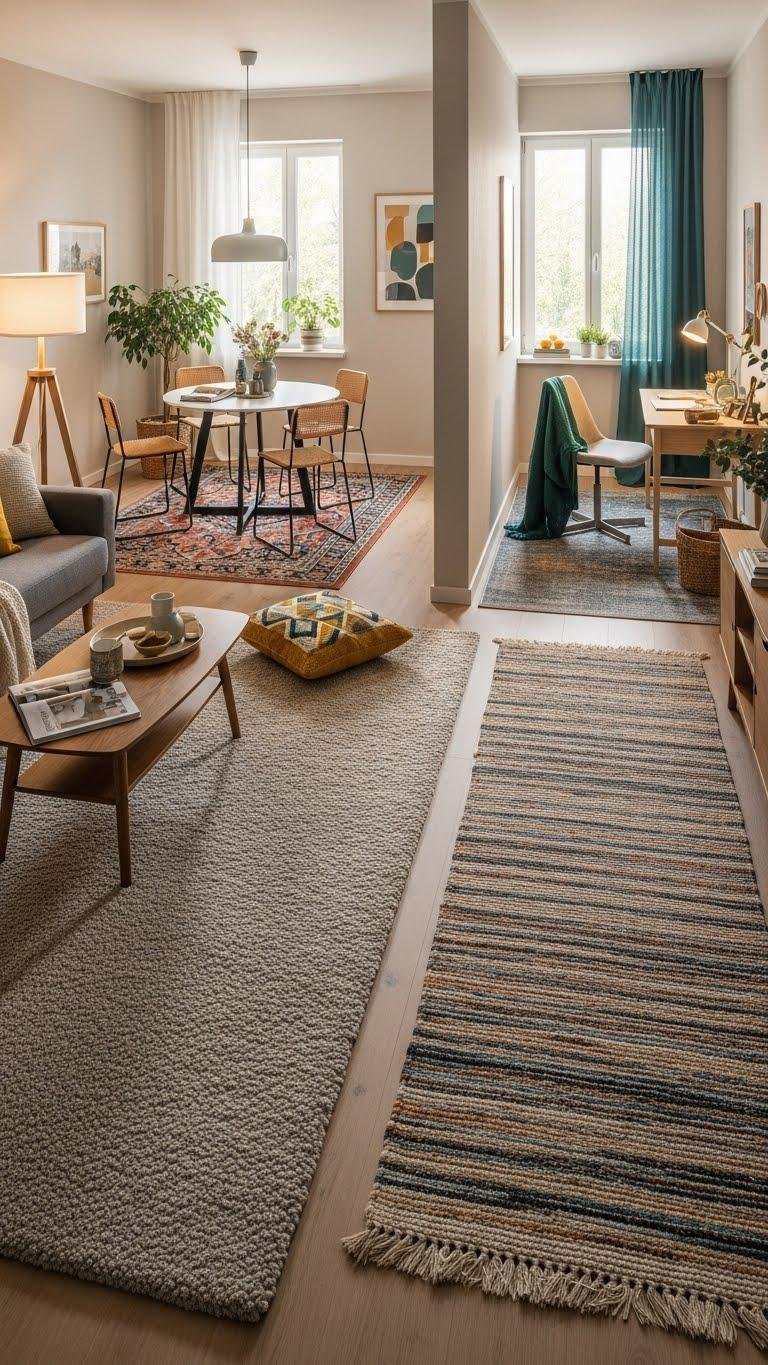Use layered rugs to define living, dining, and work areas—mix sizes, textures, and patterns. Anchor furniture so pathways stay clear. Pair rugs with zoned lighting to strengthen function and mood while keeping the layout airy and flexible.