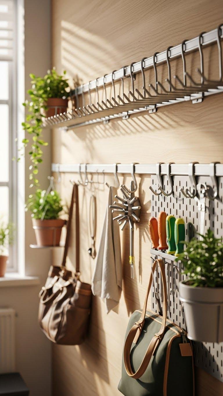 Use metal railways with peg hooks and tier prongs to arrange tools, bags, and plants. Add wall bins for mail and small gear. You’ll gain calm, instant order and the freedom to move without obstacles.