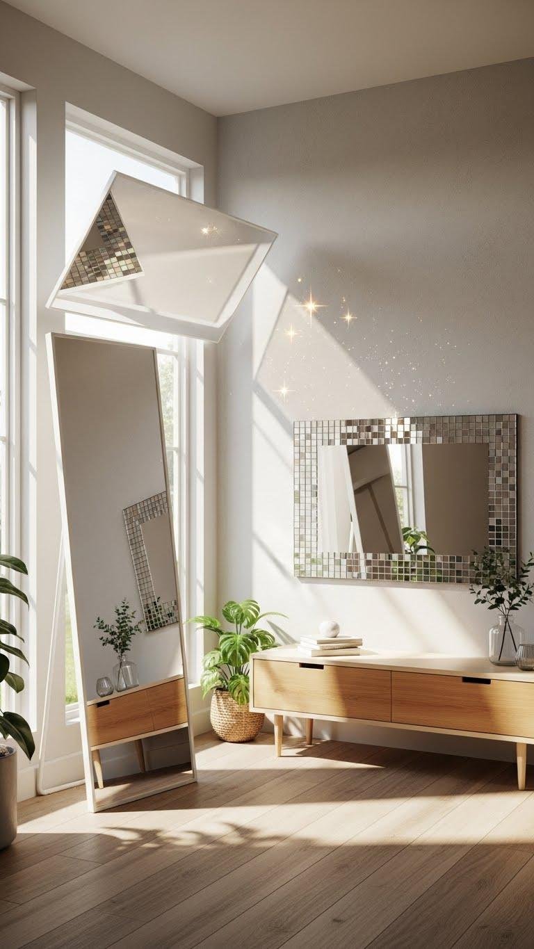 If you place mirrors strategically, they’ll bounce natural and artificial light into dark corners and instantly widen sightlines so a small room feels brighter and more open. Hang angled mirrors to direct sunlight across walls, use mosaic mirrors as focal texture, and lean a tall mirror against a wall to double perceived depth.