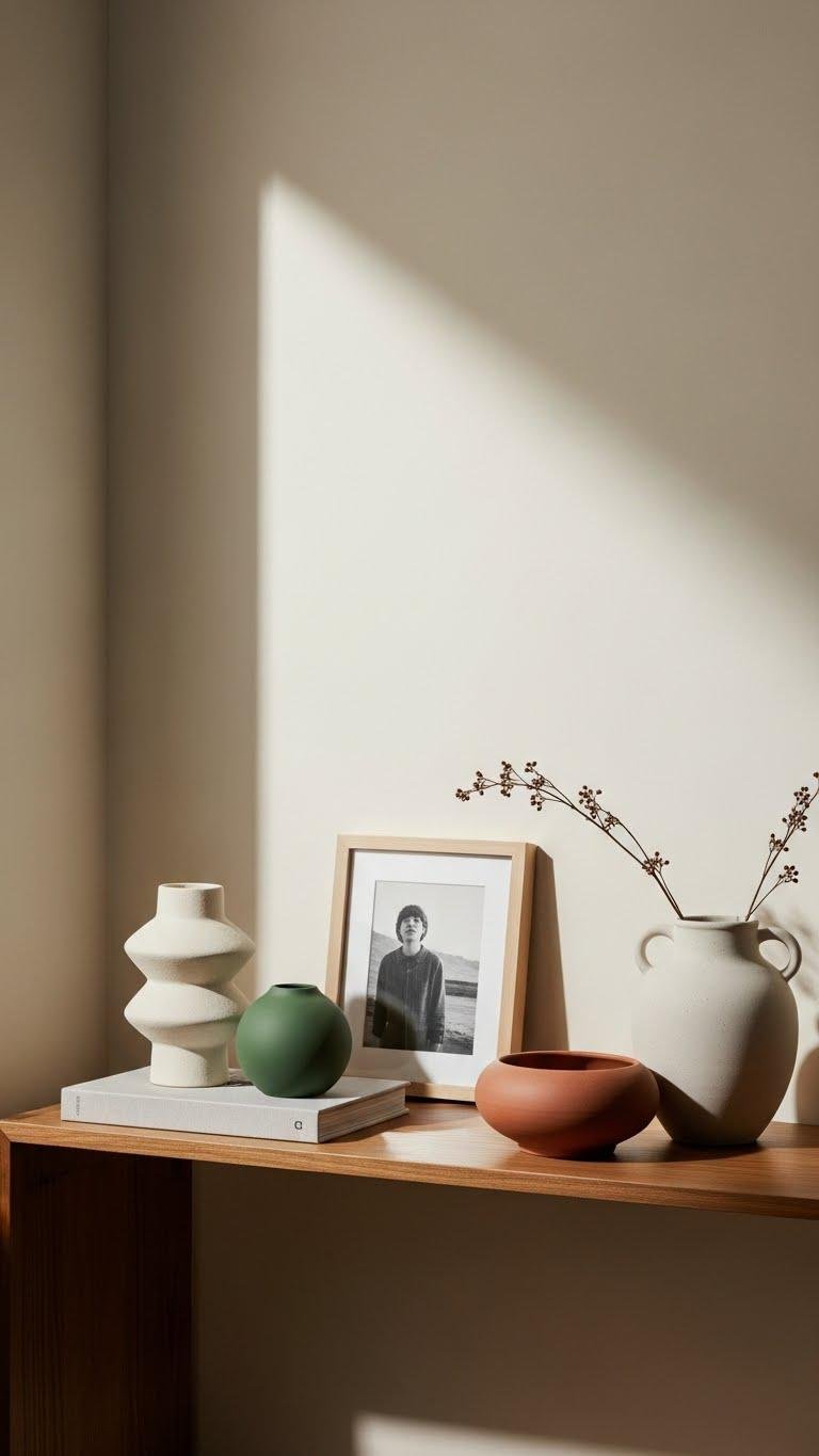 You’ll create curated clusters that read effortlessly — mixing sculptural ceramics, a single framed photo, and a tactile vase to form simple accessory narratives.