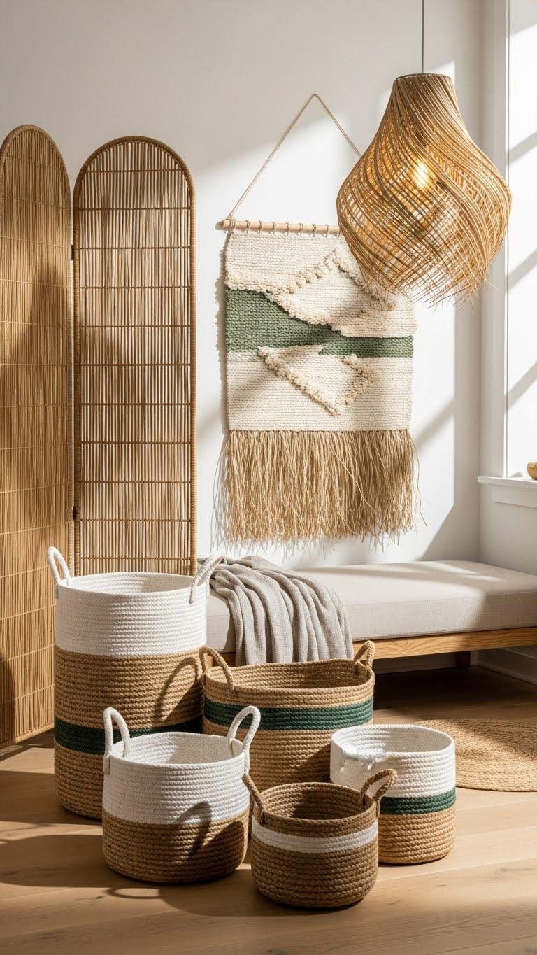 Layer woven and natural-fiber accents to bring warmth, tactility, and a quietly curated edge to your soft aesthetic. You’ll mix handcrafted jute baskets, seagrass wallart, a reed room divider, and a banana fiber lampshade to create relaxed structure and organic rhythm. These artisanal pieces feel modern yet free, grounding airy palettes while letting light, texture, and movement define your serene space.